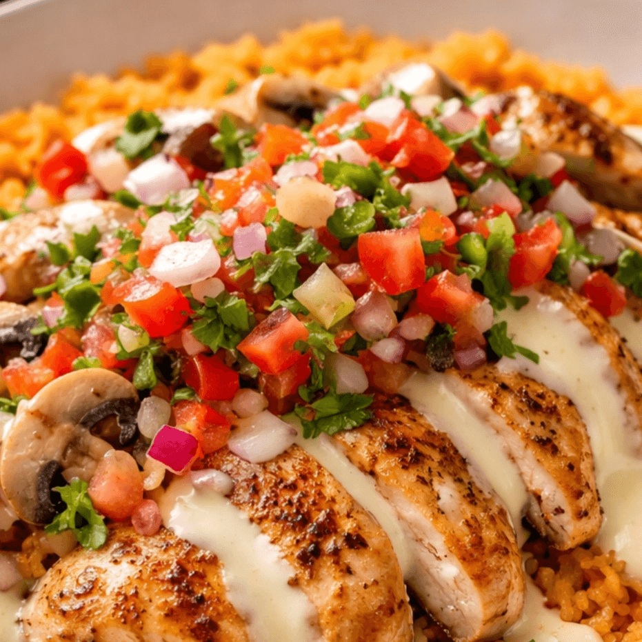 Mexican red rice topped with grilled chicken, melted queso & Pico de Gallo.