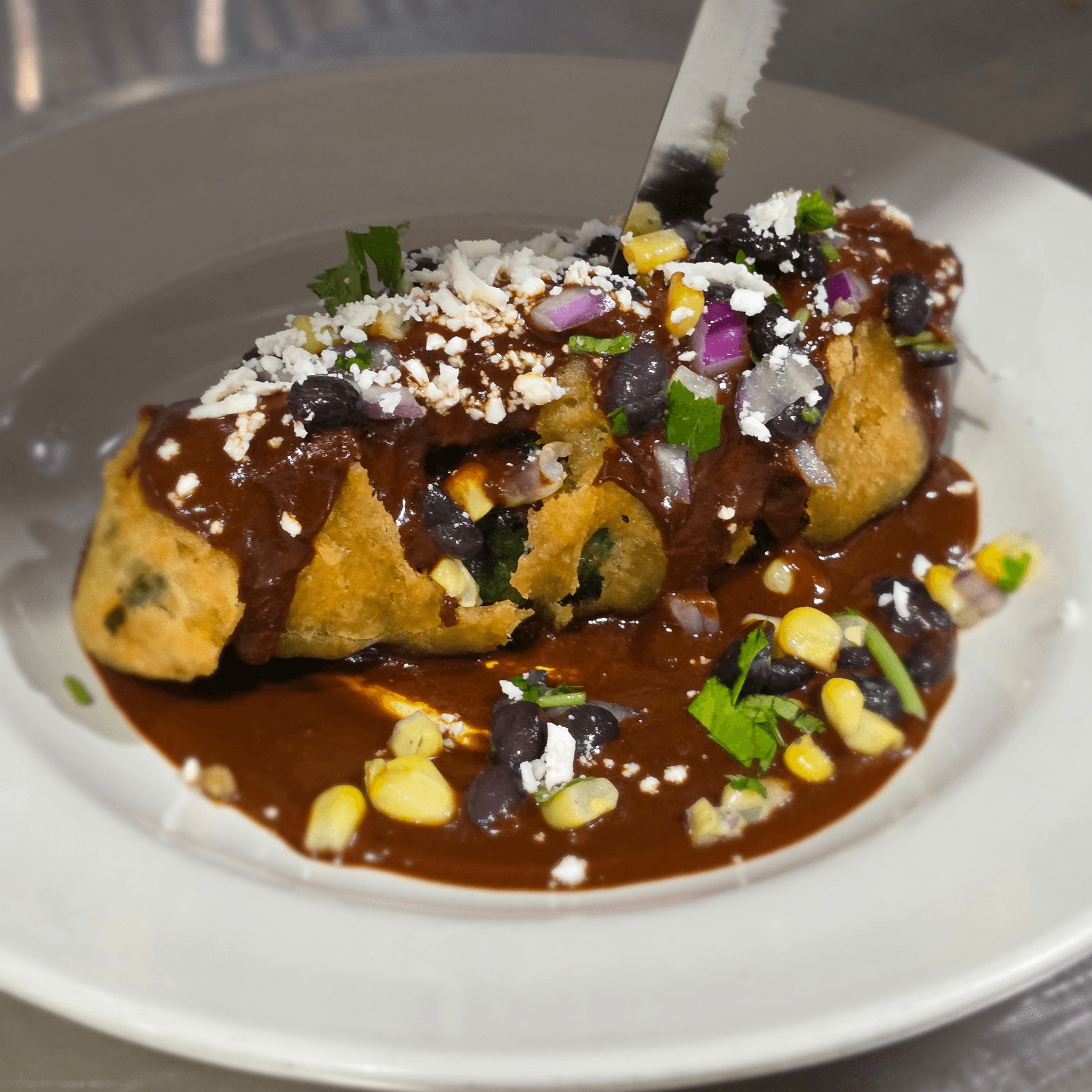 Tempura-fried poblano peppers stuffed with Oaxaca cheese and topped with mole, corn–bean salad, and cilantro. Contains peanuts & chocolate.